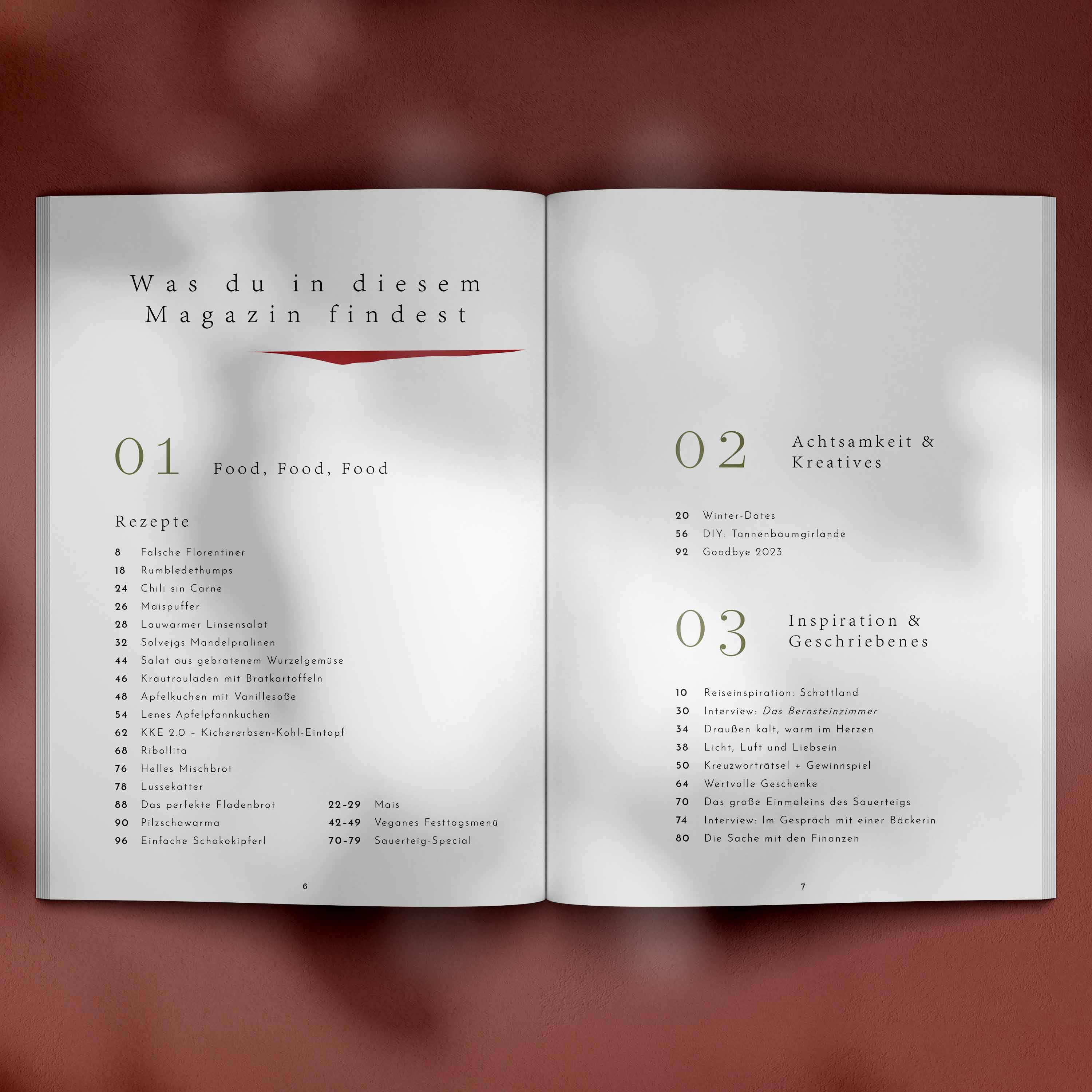 100 Seiten Winterliebe, um die kalte Jahreszeit bestmöglich zu feiern und Lust auf Ruhe, Entschleunigung und Glitzer zu machen. Mit dabei: 17 so, so gute vegane Rezepte, von Ribollita über Krautrouladen, dem perfektionierten Kichererbsen-Kohl-Eintopf und Falschen Florentinern bis hin zum perfekten Fladenbrot. Ebenfalls: Ein Sauerteig-Special mit ganz vielen Tipps und Tricks, einem Interview mit der Bäckerin Kerstin und 2 Lieblingsrezepten. Reiseinspiration und ganz viele persönliche Tipps für Schottland, dem Land der Mythen und Geheimnisse. Ein Interview mit Solvejg, der Gründerin von der bio-veganen Pralinenmanufaktur „Das Bernsteinzimmer“, und ihr persönliches Mandelpralinenrezept. Lara, die den Winter nicht ganz so liebt, wie wir, gibt Tipps und Tricks, um besser durch die Jahreszeit zu kommen und Ellie nimmt dich an die Hand, um dich selbst mit deinen eigenen Finanzen auseinanderzusetzen. Außerdem, wie immer: Ganz viel Platz für Kreativität, Selbstreflexion und Träume. Alles gepackt in unser neues Wintermagazin, das vor allem zur Entschleunigung und Ruhe inspirieren soll – und dazu, die kalte Jahreszeit, selbst wenn man kein großer Fan ist, möglichst intensiv wahrzunehmen und zu genießen.
