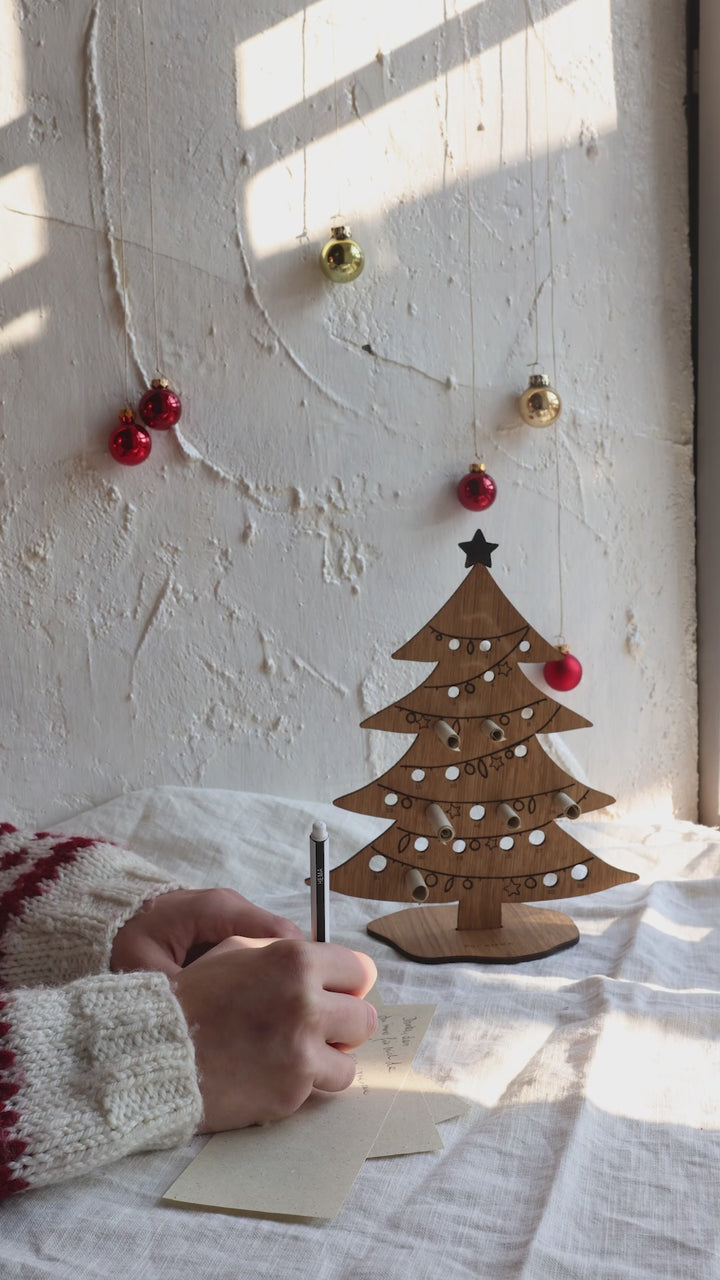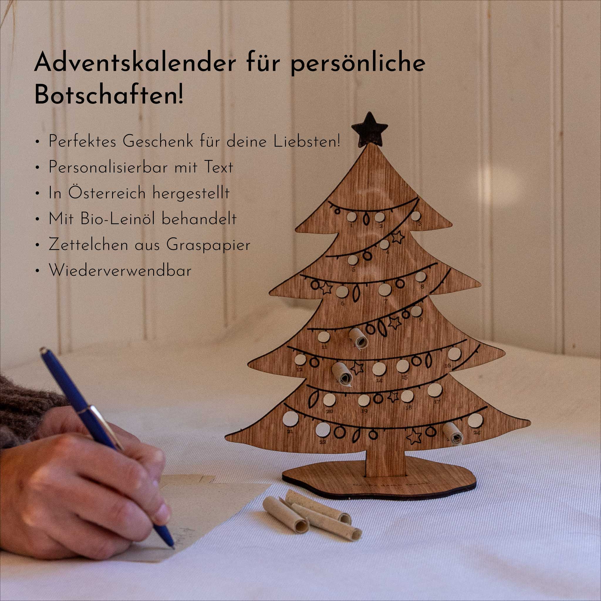 Unser Adventskalender ist perfekt für alle, die ihr Herz sprechen lassen wollen, egal ob du deinen Liebsten im Advent persönliche Botschaften schreiben möchtest oder Gutscheine für gemeinsame Unternehmungen verschenken magst. Diesen Adventskalender kannst du genau so gestalten, wie du möchtest. Wunderschön aus hochwertigem Holz mit Eichenfurnier, mit einem stilvollen Design und jährlich wiederverwendbar. In Österreich entworfen, hergestellt und verpackt. Die Standplatte des Adventskalenders ist personalisierbar, mit einem persönlichen Gruß, deinem liebsten Weihnachtslied oder einem Spruch. Der perfekte Adventskalender für alle, die es einfach, schön und möglichst persönlich lieben. Inklusive 24 Zettelchen aus Graspapier.